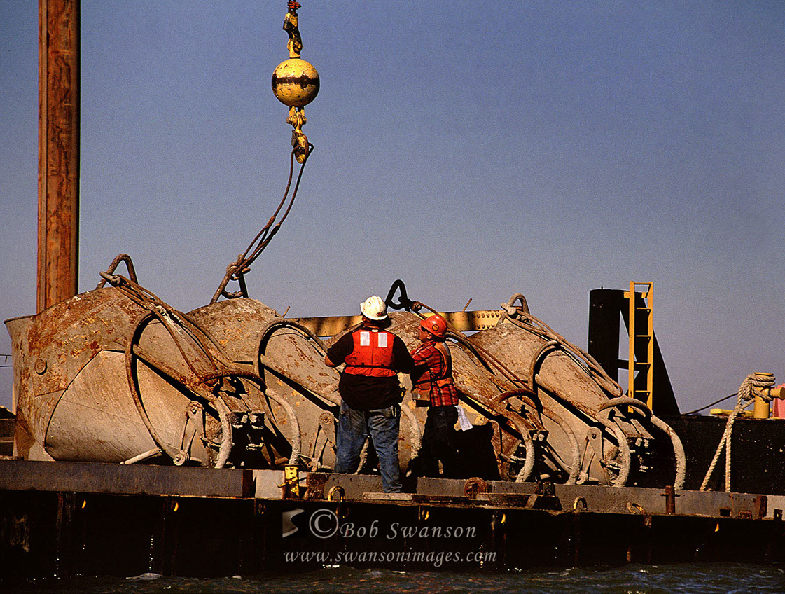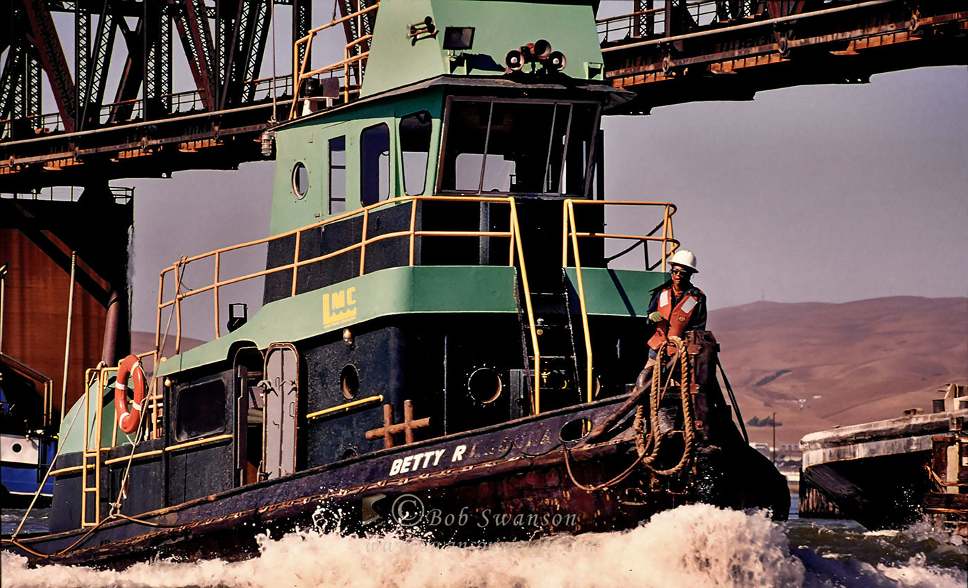 Cal Trans tugboat seaman working ropes for the seismic retrofit of the Benicia-Martinez bridge over the Sacramento River for The American Society of Civil Engineers magazine