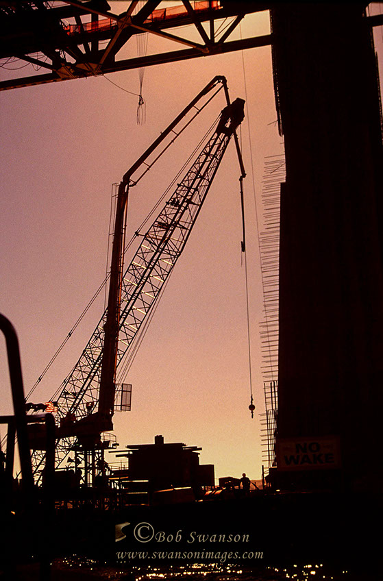 Concrete pump and crane working on the Benicia-Martinez bridge over the Sacramento River for The American Society of Civil Engineers magazine