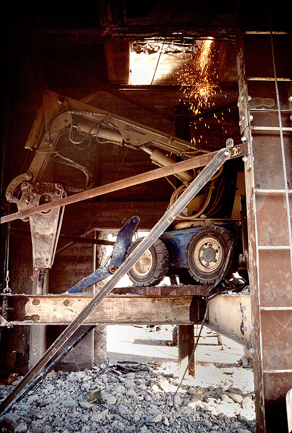 Remote operated hoe ram demolition with sparks from cutting torch. Stomper Demolition Company.