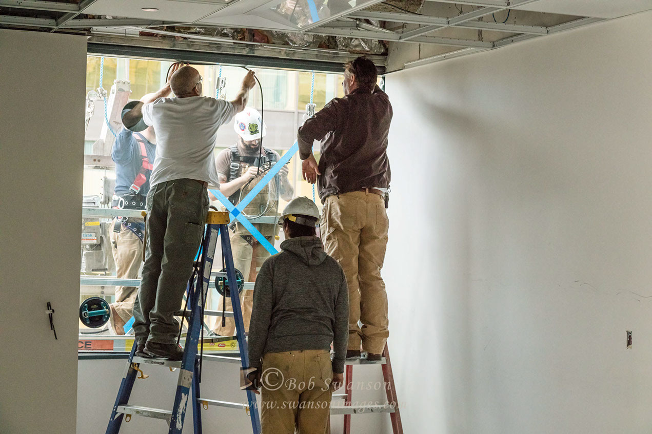 Removing a 6th floor fixed window for bringing 2 ton steel stair through the opening.