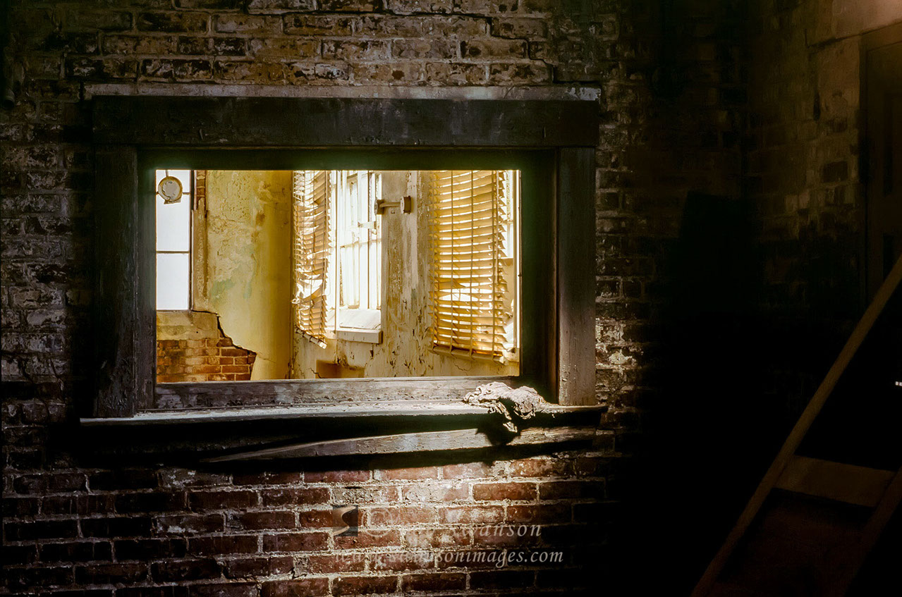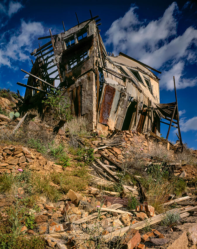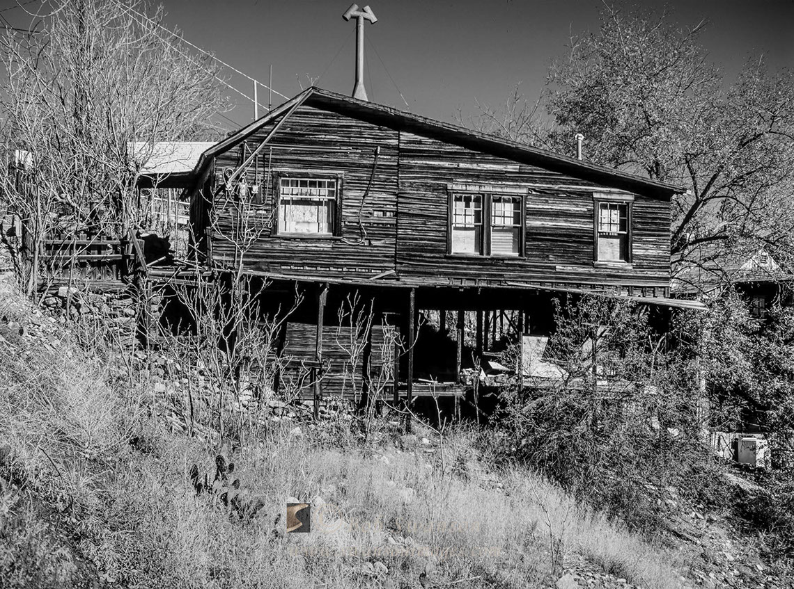 View of Daisy Hotel ruins from the kitchen window of the Powder Box Church for cover story for Country Home Magazine.