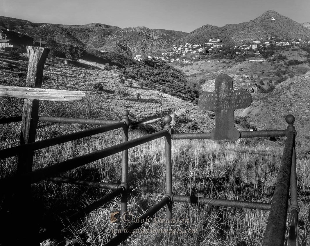 Graveyard cages and crosses with view of Jerome. Cages to keep coyotes from digging up the graves.