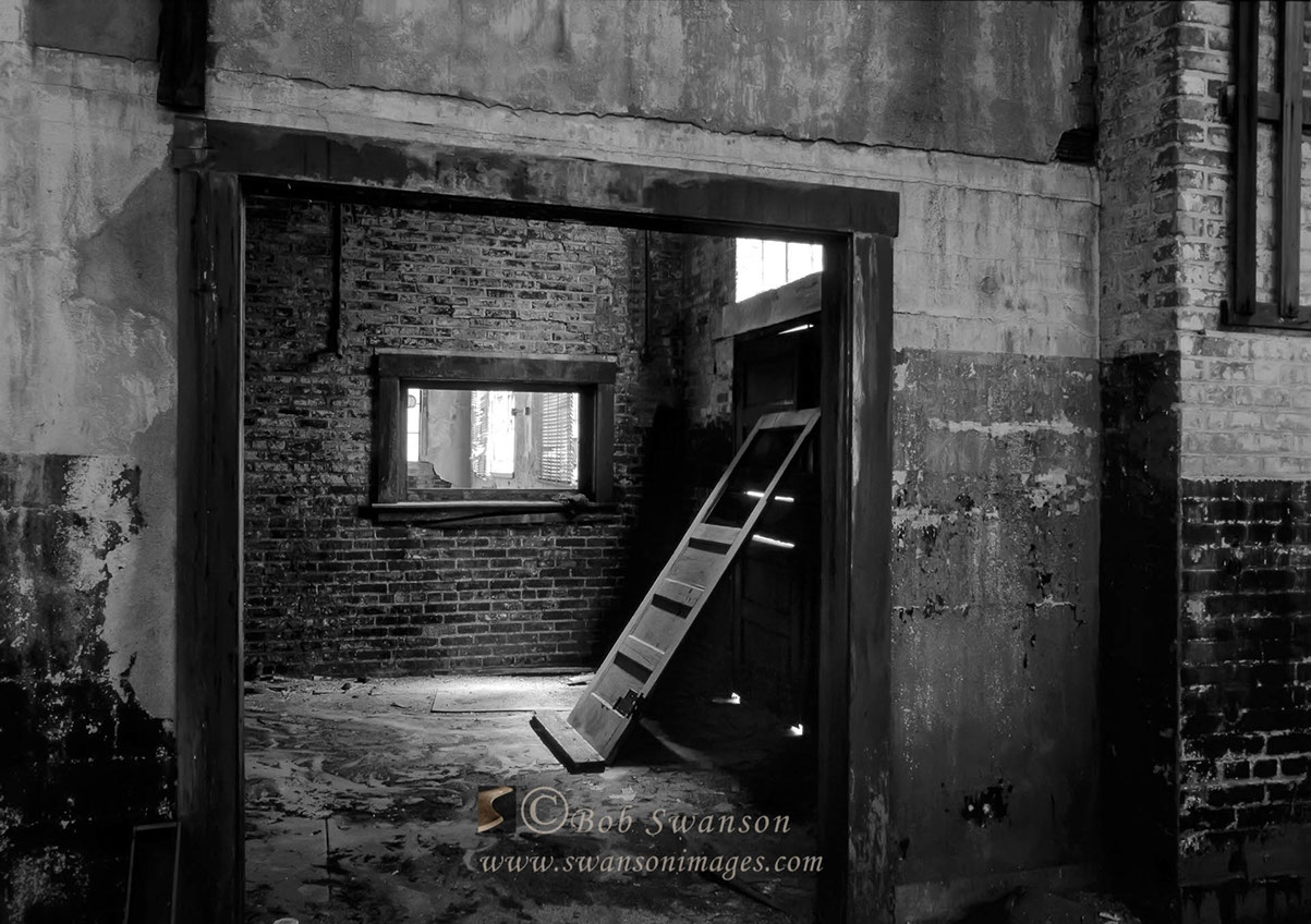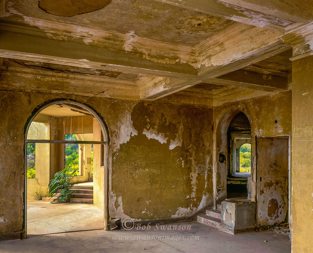 Interior/exterior broken plaster and arched doorways.