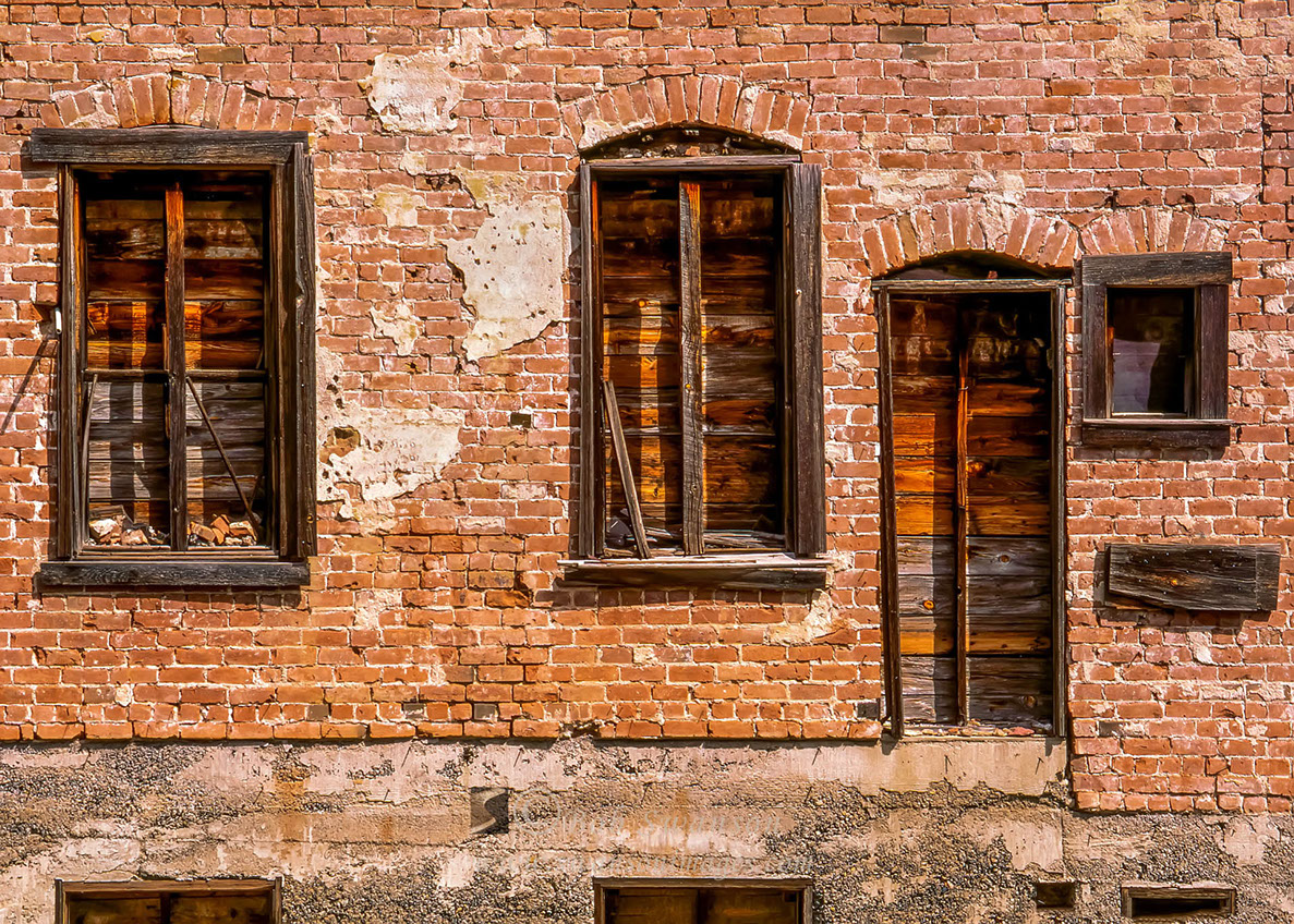 Brick wall and boarded up windows of the "Dry".