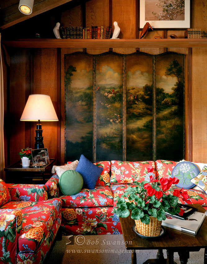 Mountain home living room with floral couch and antique screen for Betty Cutten Design