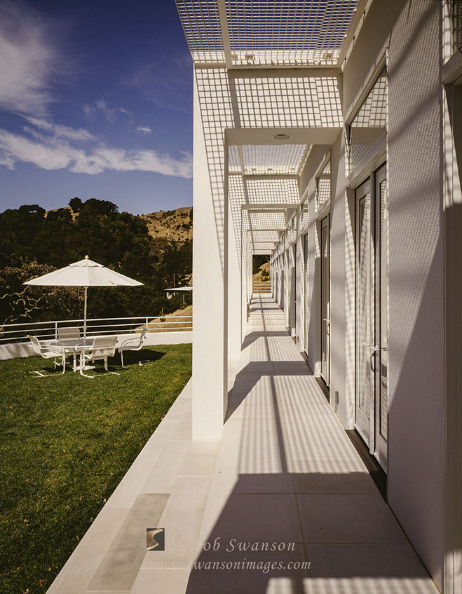 Marin County hill top home with patio umbrella and walkway.